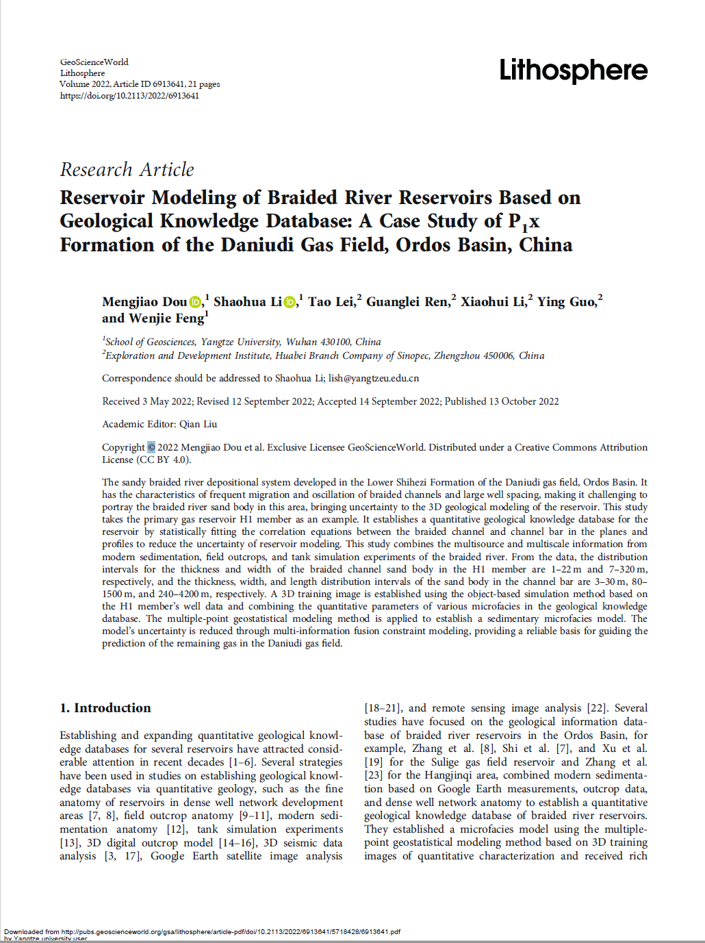 伟德国际1949官网博士生窦梦皎在《Lithosphere》上发表题为“Reservoir Modeling of Braided River Reservoirs Based onGeological Knowledge Database: A Case Study of P1xFormation of the Daniudi Gas Field, Ordos Basin, China”的研究论文。伟德国际1949官网为论文第一署名单位,博士生窦梦皎为论文第一作者,其导师李少华为通讯作者。