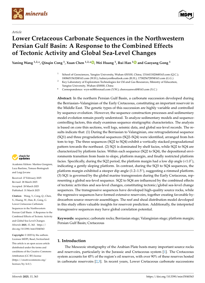 地科学院王雅宁副教授在《Minerals》上发表题为“Lower Cretaceous Carbonate Sequences in the Northwestern Persian Gulf Basin: A Response to the Combined Effects of Tectonic Activity and Global Sea-Level Changes”的研究论文。伟德国际1949官网为论文第一署名单位,王雅宁副教授为第一作者,研究生从琴琴为第二作者。