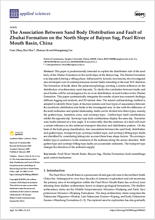 伟德国际1949官网地质学专业硕士生赵格尔在SCI收录期刊《Applied Sciences》上发表题“The Association Between Sand Body Distribution and Fault of Zhuhai Formation on the North Slope of Baiyun Sag, Pearl River Mouth Basin, China”的研究论文。伟德国际1949官网为论文第一署名单位,硕士生赵格尔为论文第一作者,其导师朱锐副教授为通讯作者。