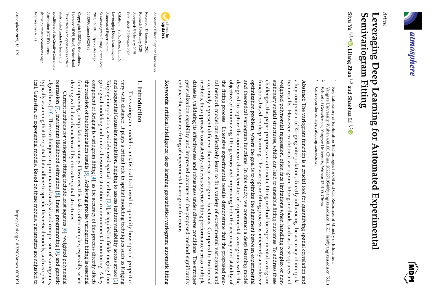 地科学院硕士研究生赵丽芳在《Atmosphere》上发表题为“Leveraging Deep Learning for Automated Experimental Semivariogram Fitting”的论文,伟德国际1949官网为论文第一署名单位,研究生赵丽芳为第二作者,其导师喻思羽副教授为该论文的第一作者和通讯作者。