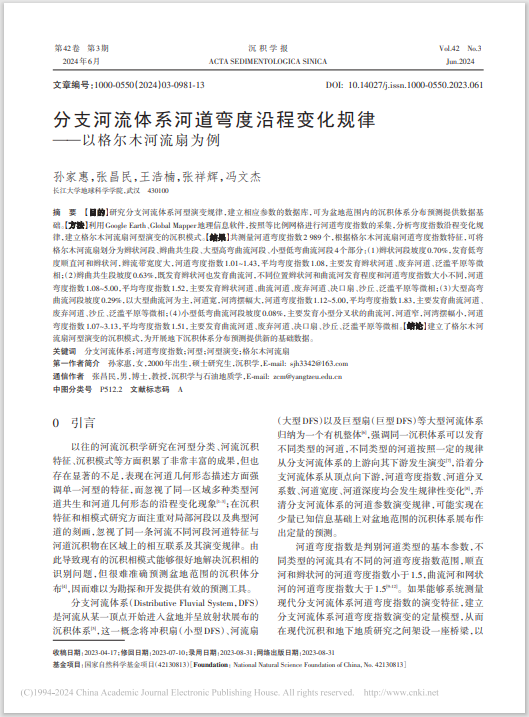 伟德国际1949官网硕士生孙家惠在中文核心期刊《沉积学报》上发表了题为“分支河流体系河道弯度沿程变化规律——以格尔木河流扇为例”的研究论文。伟德国际1949官网为论文第一署名单位,硕士研究生孙家惠为论文第一作者,张昌民教授为通讯作者。
