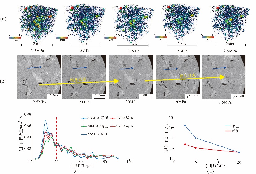该研究以塔里木盆地库车坳陷阿合组致密砂岩储层为研究对象,通过铸体薄片观察及统计,明确研究区储层孔隙发育类型,在此基础上利用应力敏测试结合原位微米CT扫描技术建立储层不同孔隙结构的数字提取及表征,并进行应力敏感性机理分析。通过微米CT原位扫描技术表征了应力敏损害的方式,储层中较大孔隙(粒内和粒间溶孔),在整个应力敏损害过程中基本没有发生变化,而微孔和微裂缝在应力增加过程中发生了较大的变化,降压后恢复程度较低,表明造成强应力敏损害的主控因素是微孔隙和微裂缝的塑性变化。该研究为致密砂岩储层的应力敏感性机理提供了新的科学认识,对油气藏高效开发具有重要指导意义。
