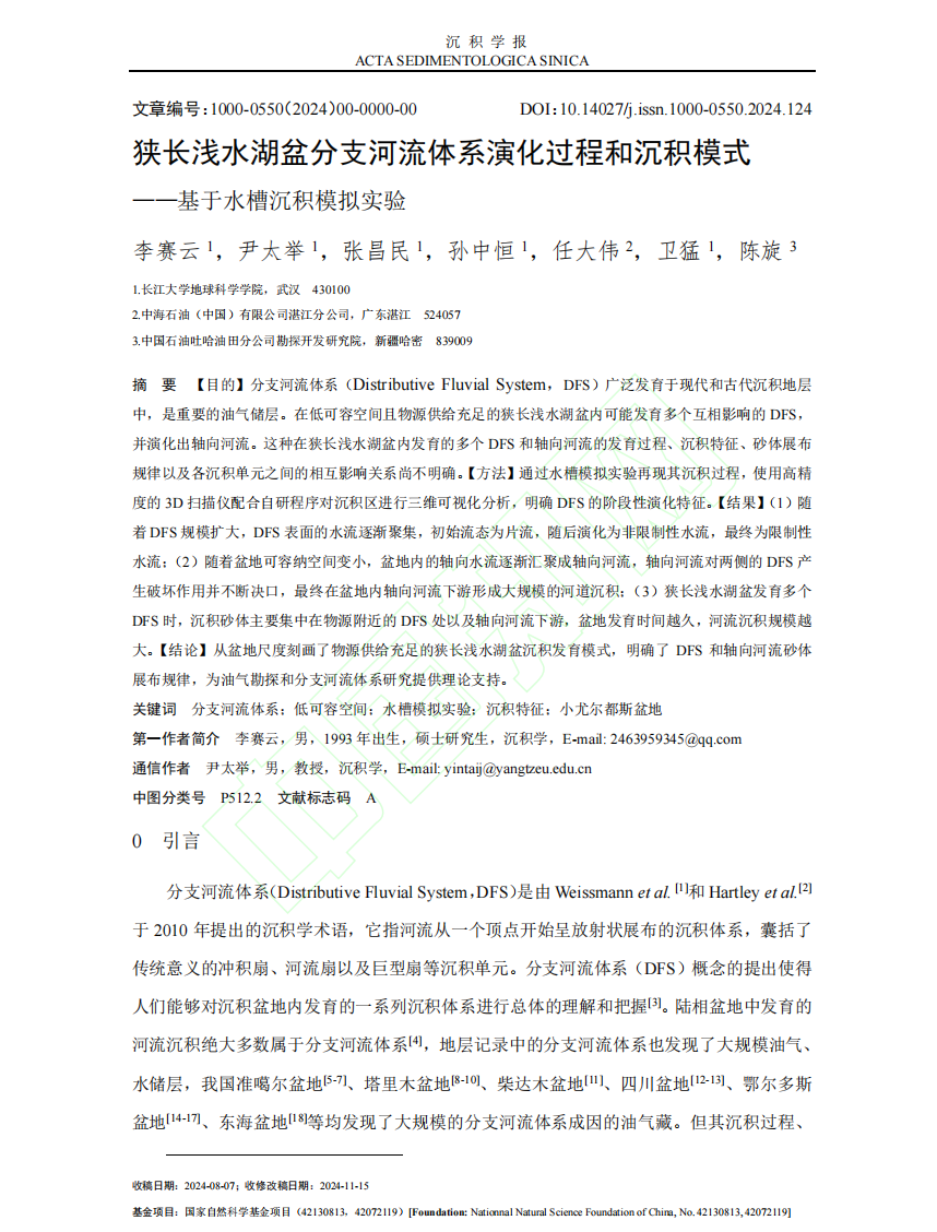 地科学院研究生李赛云在《沉积学报》上发表题为“狭长浅水湖盆分支河流体系演化过程和沉积模式——基于水槽沉积模拟实验”的研究论文。伟德国际1949官网为论文第一署名单位,研究生李赛云为论文第一作者,其导师尹太举教授为通讯作者。