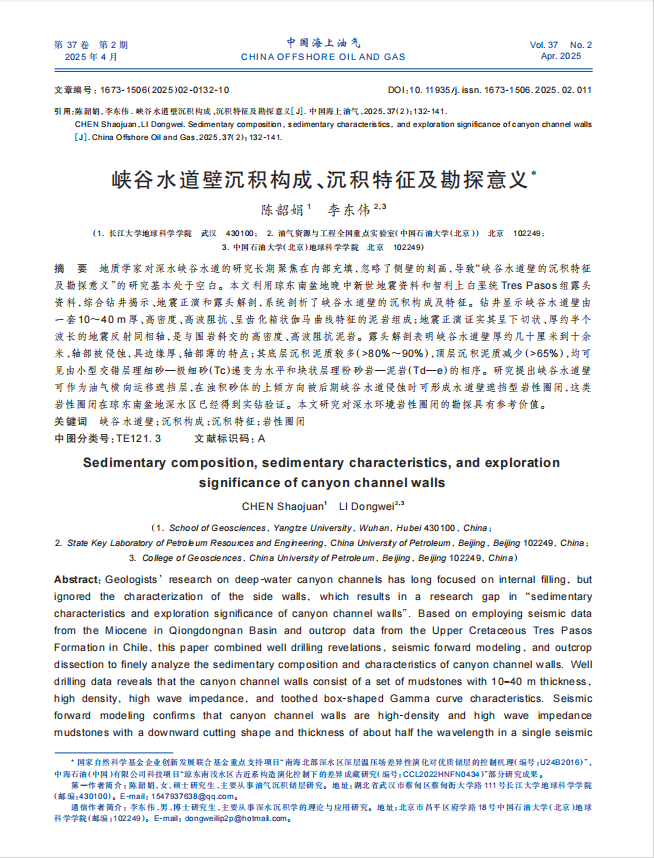 伟德国际1949官网硕士生陈韶娟在期刊《中国海上油气》上发表了题为“峡谷水道壁的沉积特征、沉积模式及勘探意义”的研究论文。伟德国际1949官网为论文第一署名单位,陈韶娟为第一作者。