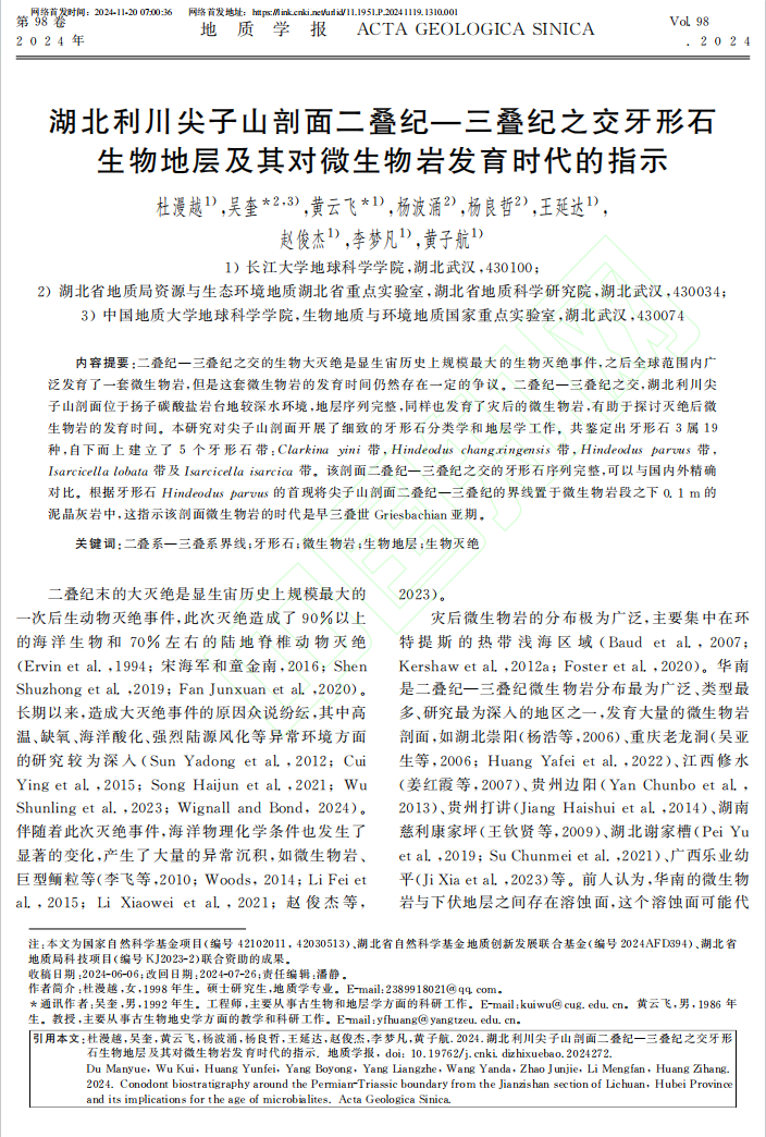 地科学院黄云飞教授团队长期从事古-中生代之交重大地质转折期生物灭绝与生物复苏方面的研究,团队成员杜漫越在地质学报EI期刊上发表题为“湖北利川尖子山剖面二叠纪—三叠纪之交牙形石生物地层及其对微生物岩发育时代的指示”的研究论文。伟德国际1949官网为论文第一署名单位,硕士研究生杜漫越为论文第一作者,其导师黄云飞教授与地质科学研究院的吴奎高级工程师为该文通讯作者。