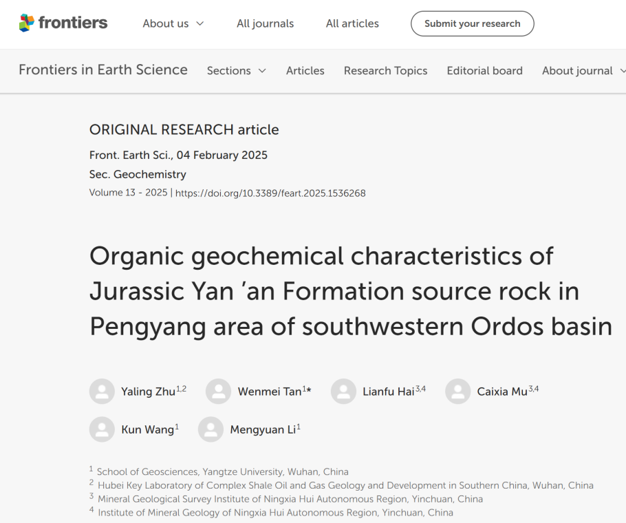 伟德国际1949官网教师朱亚玲在SCI收录期刊《Frontiers in Earth Science》上发表题为“Organicgeochemical characteristicsofJurassicYan’anFormationsourcerockinPengyangareaofsouthwestern Ordosbasin”的研究论文,伟德国际1949官网为论文第一署名单位,朱亚玲教师为第一作者,谭文梅硕士生为第一通讯作者。