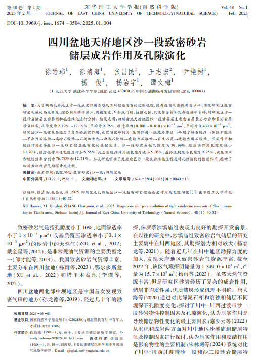 伟德国际1949官网硕士生徐皓玮在期刊《东华理工大学学报(自然科学版)》上发表题为“四川盆地天府地区沙一段致密砂岩储层成岩作用及孔隙演化”的研究论文。伟德国际1949官网为论文第一署名单位,徐清海副教授为通讯作者。