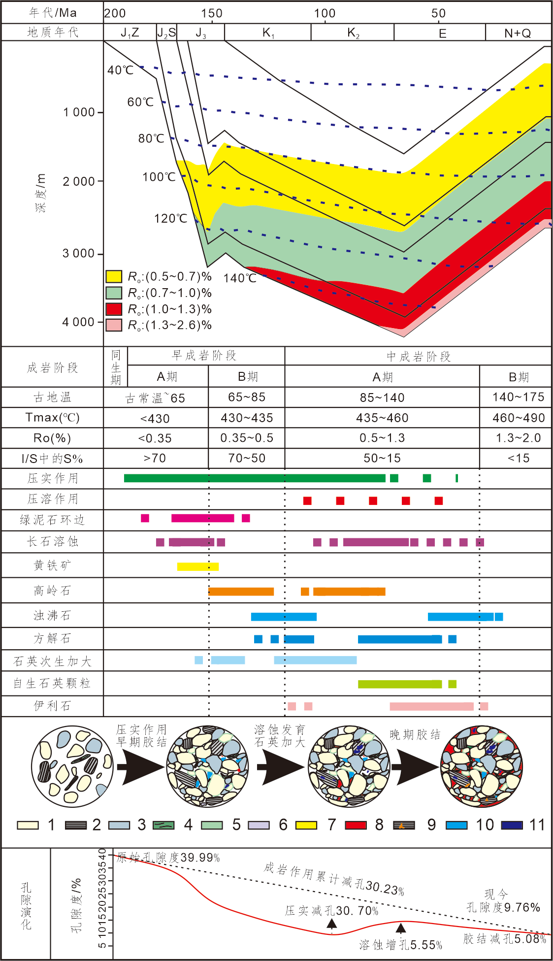 1.石英;2.长石;3.岩屑;4.云母;5.绿泥石环边;6.浊沸石;7.硅质胶结;8.方解石胶结;9.长石伊利石化;10.剩余原生孔隙;11.次生孔隙;I/S中%S为伊/蒙混层中蒙皂石层质量分数。