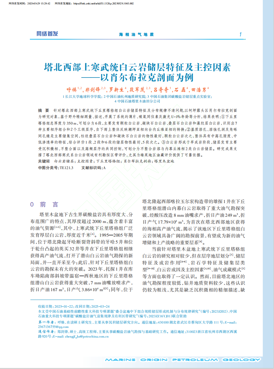 近日,伟德国际1949官网硕士生呼焕在中文核心期刊《海相油气地质》上发表题为“塔北西部上寒武统白云岩储层特征及主控因素 ——以肖尔布拉克剖面为例”的研究论文。该论文针对塔北西部上寒武统下丘里塔格组白云岩储层特征及分布规律不清问题,以柯坪露头区肖尔布拉克剖面为研究对象,基于野外精细测量、描述,开展了系统的薄片、碳氧同位素及激光U-Pb年龄等分析。伟德国际1949官网为论文第一署名单位,硕士生呼焕为论文第一作者。