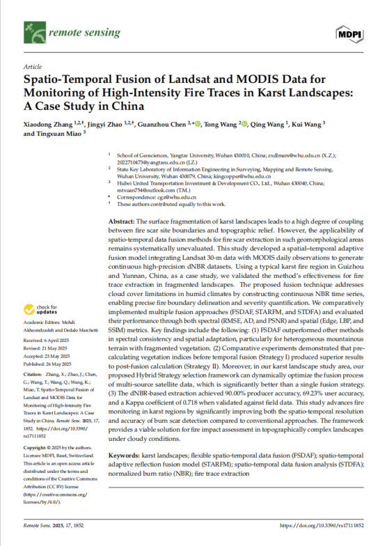 近日,伟德国际1949官网地图制图学与地理信息工程专业2022级研究生赵菁怡在SCI期刊《REMOTE SENSING》发表题为“Spatio-Temporal Fusion of Landsat and MODIS Data for Monitoring of High-Intensity Fire Traces in Karst Landscapes: A Case Study in China”的研究论文。伟德国际1949官网为论文第一署名单位,员工赵菁怡与导师张晓东教授为论文第一作者,导师王庆副教授为共同作者。