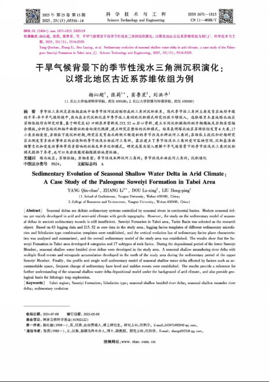 伟德国际1949官网硕士生杨沁超在中文核心期刊《科学技术与工程》上发表了题为“干旱气候背景下的季节性浅水三角洲沉积演化:以塔北地区古近系苏维依组为例”的研究论文。伟德国际1949官网为论文第一署名单位,硕士研究生杨沁超为论文第一作者,张莉副教授为通讯作者。