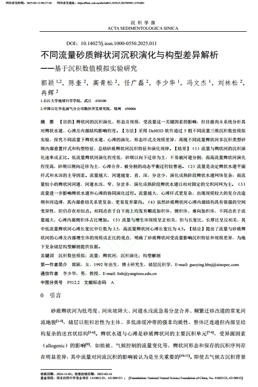 伟德国际1949官网郭颖博士在《沉积学报》上发表题为“不同流量砂质辫状河沉积演化与构型差异解析——基于沉积数值模拟实验研究”的研究论文。
