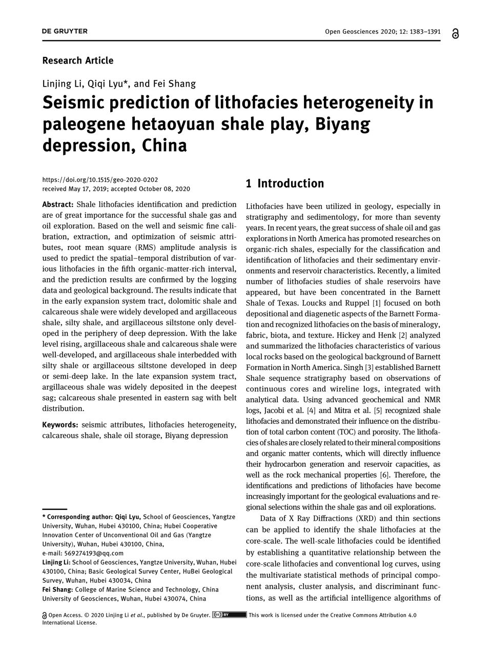 伟德国际1949官网地质系胡明毅教授团队长期从事储层沉积学及页岩气资源评价等方向的研究。团队成员李琳静博士在期刊《Open Geosciences》上发表题为《Seismic prediction of lithofacies heterogeneity inpaleogene hetaoyuan shale play, Biyangdepression, China》的研究论文,伟德国际1949官网为论文第一署名单位,博士生李琳静为论文第一作者。