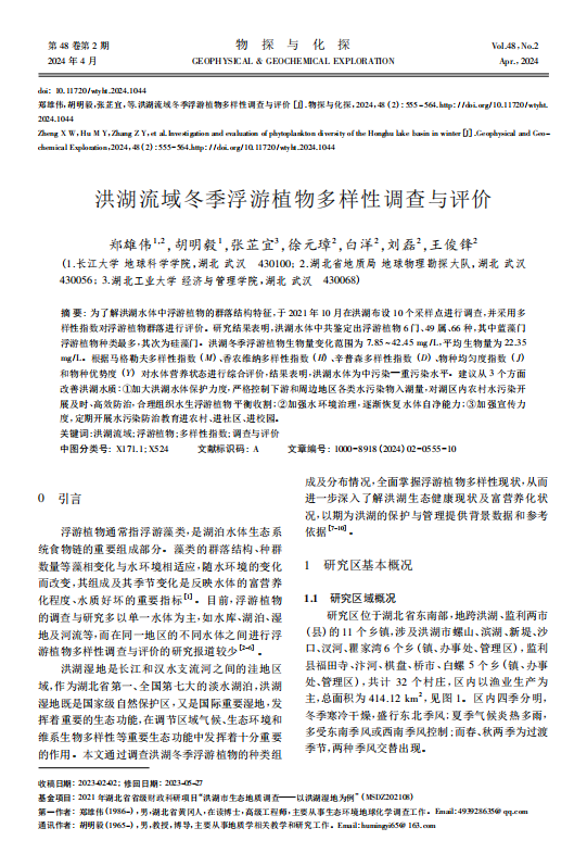 伟德国际1949官网博士生郑雄伟在《物探与化探》上发表题为“洪湖流域冬季浮游植物多样性调查与评价”的研究论文。该论文通过调查洪湖冬季浮游植物的种类组成及分布情况,全面掌握了浮游植物多样性现状,深入研究了洪湖生态健康现状及富营养化状况,为洪湖的保护与管理提供了背景数据和参考依据。