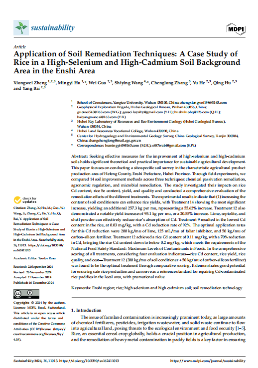 地科学院博士生郑雄伟在《Sustainability》上发表题为《Application of Soil Remediation Techniques: A Case Study ofRice in a High-Selenium and High-Cadmium Soil BackgroundArea in the Enshi Area》的研究论文。伟德国际1949官网为论文第一署名单位,博士生郑雄伟为论文第一作者,教师胡明毅为通讯作者。