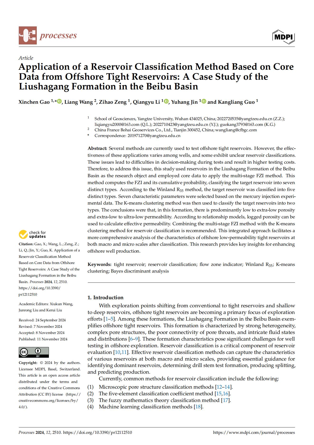伟德国际1949官网22级博士研究生在期刊《Processes》上发表题为“Application of a Reservoir Classification Method Based on CoreData from Offshore Tight Reservoirs: A Case Study of theLiushagang Formation in the Beibu Basin”的研究论文。伟德国际1949官网为论文第一署名单位,高昕晨为第一通讯作者。