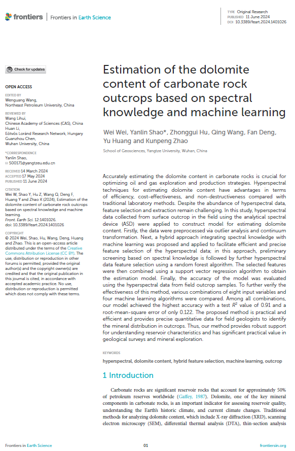 公司魏薇博士在国际学术期刊《Frontiers in Earth Science》上发表了题为“Estimation of the Dolomite Content of Carbonate Rock Outcrops Based on Spectral Knowledge and Machine Learning”的SCI论文,提出了一种融合光谱知识与机器学习的白云石含量预测方法,为碳酸盐岩矿物成分的快速定量分析提供了新的技术手段。