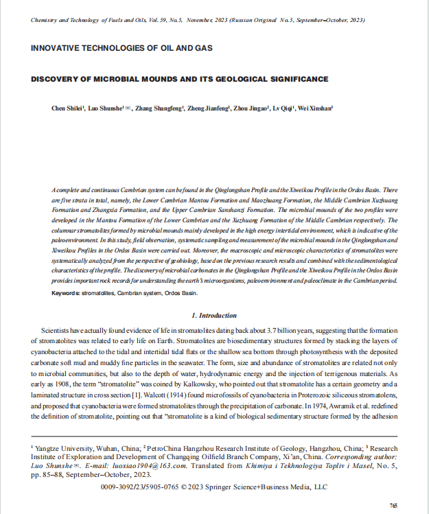 地科学院博士生陈世磊在《Chemistry and Technology of Fuels and Oils》上发表题为“DISCOVERY OF MICROBIAL MOUNDS AND ITS GEOLOGICAL SIGNIFICANCE”的研究论文。该论文,以鄂尔多斯盆地寒武系青龙山剖面和西磑口剖面叠层石为研究对象,对青龙山剖面以及西磑口剖面沉积构造特征进行观察和测量。
