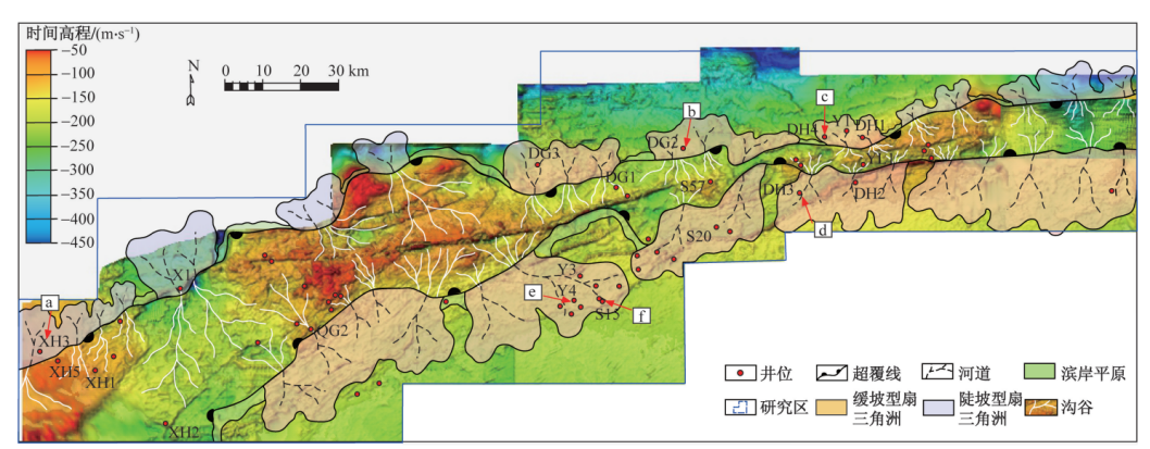 通过利用岩心、测井、三维地震等资料的方法,研究了塔里木盆地雅克拉断凸及周缘地区白垩系亚格列木组沉积相类型及空间展布特征,以源汇理论为指导分析物源区特征对扇三角洲的发育的控制作用。 结果表明:雅克拉断凸及周缘地区亚格列木组发育扇三角洲群沉积。 在亚格列木组沉积时期,雅克拉断凸地区的古隆起具有明显的分段性,呈北东东向的条带状隆起,呈现东、西两个凸起,中部地势低的特征。基于源-汇体系分析,明确扇三角洲群沉积物源来自古隆起风化剥蚀区域,多支古沟谷为扇三角洲群沉积提供了沉积物输送通道(图1)。 可见古地貌、沟谷发育特征等控制着雅克拉断凸及周缘地区亚格列木组源-汇体系,形成多物源供给的沉积格局,古隆起西段主要表现为高隆起、沟谷面积较大;东段主要表现为低隆起、沟谷面积较小。物源区沟谷的发育规模控制了古隆起周缘三角洲沉积展布规模。古隆起以南发育缓坡型扇三角洲沉积体系,以北发育陡坡型和缓坡型扇三角洲沉积体系(图2)。源-汇体系分析降低了亚格列木组沉积相研究的不确定性,可以为油气勘探提供更多地质依据。