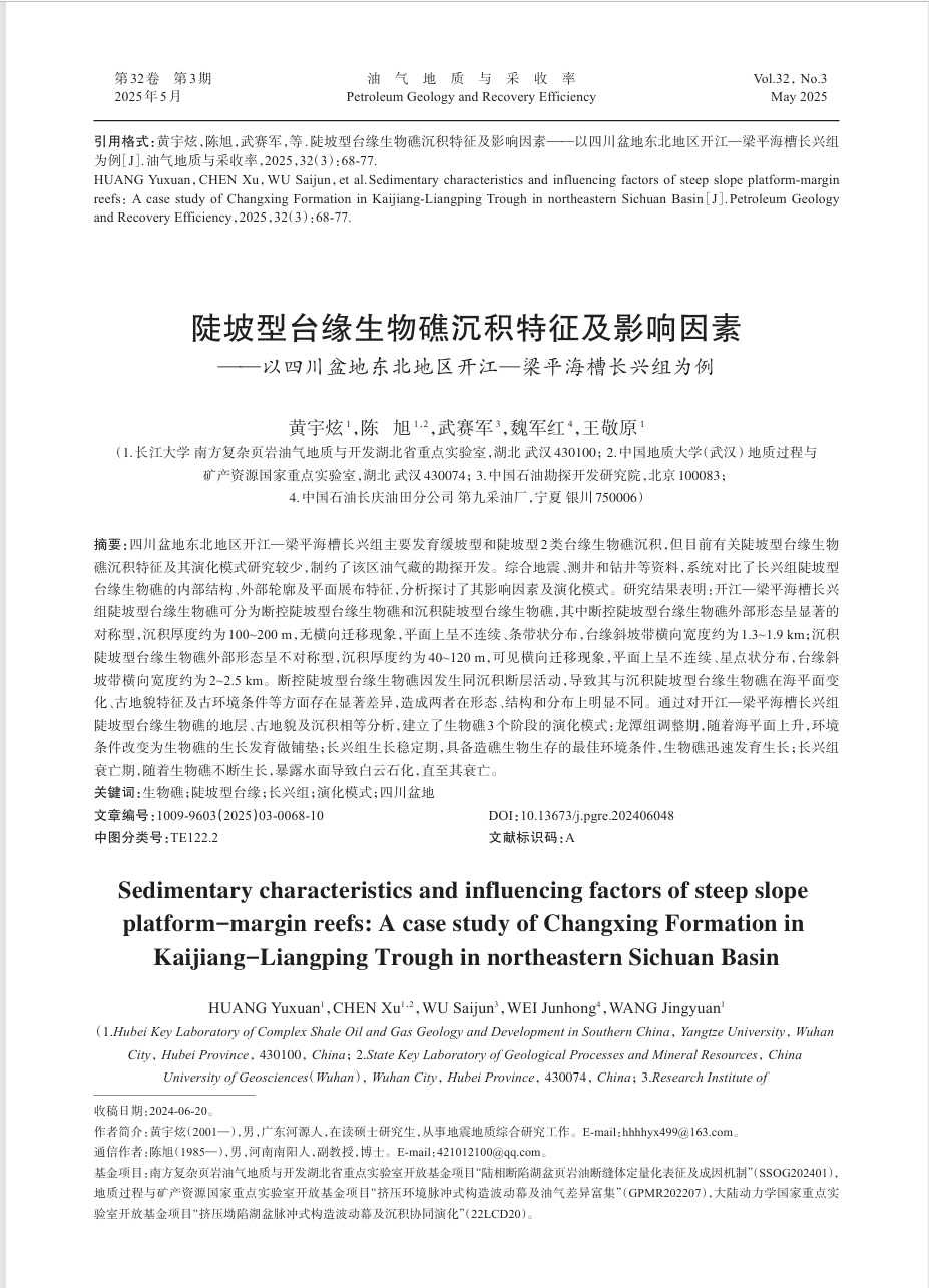 近日,伟德国际1949官网地质学专业2024级硕士生黄宇炫在中文核心期刊《油气地质与采收率》发表题为“陡坡型台缘生物礁沉积特征及影响因素——以四川盆地东北地区开江—梁平海槽长兴组为例”的研究论文。伟德国际1949官网为论文第一署名单位,硕士生黄宇炫为论文第一作者,其导师陈旭副教授为通讯作者。