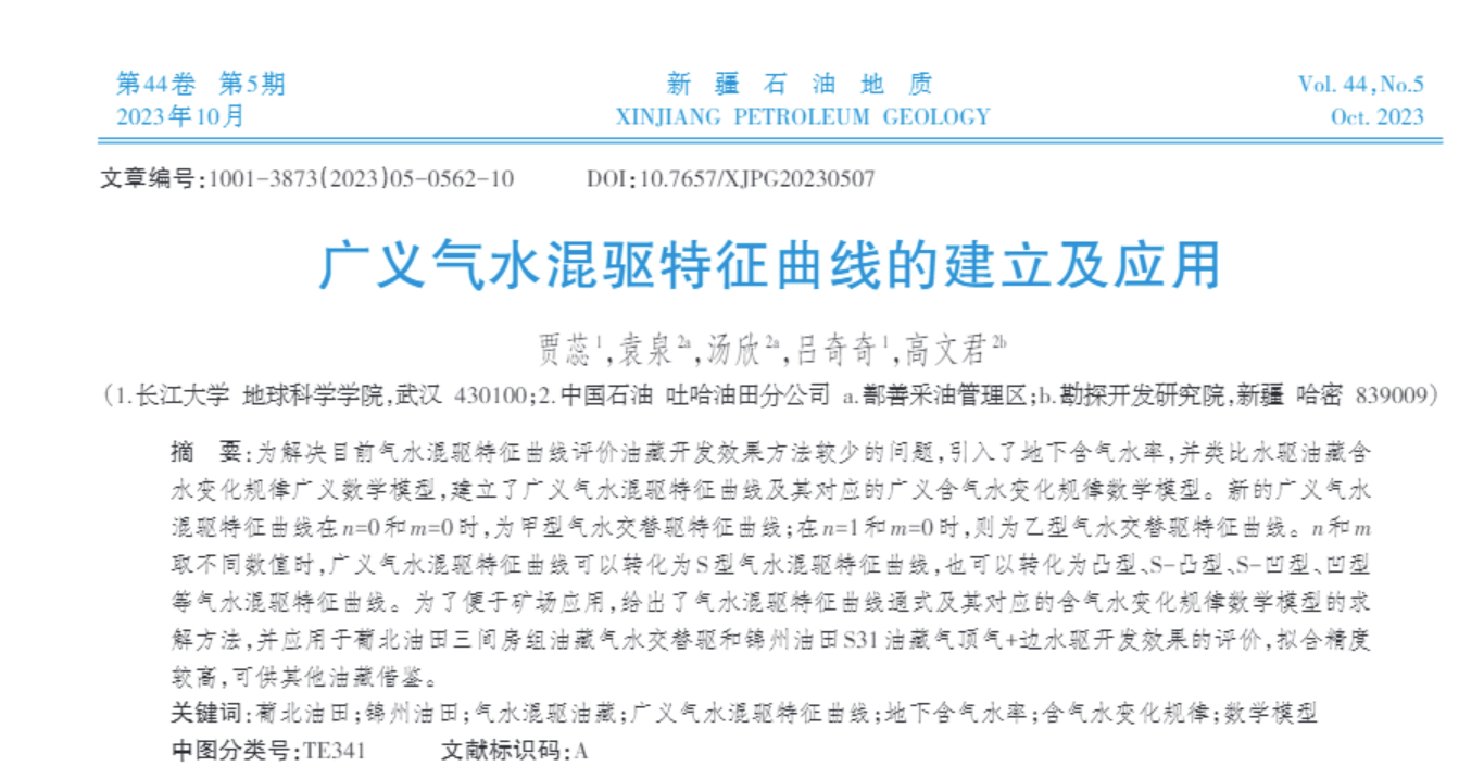 2023年9月26日,伟德国际1949官网22级硕士研究生贾蕊在《新疆石油地质》上发表题为“广义气水混驱特征曲线的建立及应用”的研究论文,伟德国际1949官网为论文第一署名单位,硕士研究生贾蕊为论文第一作者。