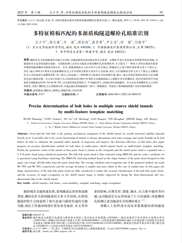 地科学院硕士生王少宁在《测绘通报》上发表论文提出一种基于多特征模板匹配的多源盾构隧道螺栓孔自动识别方法 地科学院硕士生王少宁在测绘领域期刊《测绘通报》上发表题为“多特征模板匹配的多源盾构隧道螺栓孔精准识别”的研究论文。 该研究主要针对盾构隧道激光扫描过程中螺栓孔因位置不一、姿态多样导致成像后目标形状不一的问题,以及盾构隧道内壁、渗漏水等对象因灰度值与目标较为相似对识别造成干扰的问题,本文提出了一种基于多特征模板匹配的多源盾构隧道螺栓孔自动识别方法(图1)。该方法将盾构隧道螺栓孔三维点云中心坐标用于锁定图像目标检测区域,利用螺栓孔灰度、形状以及梯度信息精准识别螺栓孔。在耗时相近的情况下,与同类方法相比,本文方法识别率提高了3.54%,识别精度提高了3.28%,最大像素偏差降低了4.68,平均偏差降低了1.35,具有更好的准确性和鲁棒性(图2)。 《测绘通报》(月刊)创刊于1955年,是由自然资源部主管、中国地图出版社有限公司主办、测绘出版社有限公司出版的反映我国测绘科技发展现状、推广测绘生产技术经验、指导全国测绘生产业务和服务自然资源监测的综合性、技术性刊物。包括大地测量、全球导航卫星系统(GNSS)、摄影测量、遥感(RS)、地图制图、地理信息系统(GIS)、工程测量、矿山测量、地籍测绘、海洋测绘等方面的新成果和新技术及其在生态环境保护、自然资源管理、土地、地质、矿产、水利、交通、电力、海洋等行业的应用情况。 论文链接: https://kns.cnki.net/kcms2/article/abstract?v=_uHp55J8LtDnqTFs1238SvN7StedWuSMfLaybDHWb52o-GTDY-4HAMGDxTuJmfJ6uaB3GToGIEhOJEaMzBUOpcb-oj2UT0HCX7ZN2cUf44ynqpFXcqpf3MKLvdpFbJ5u7HwVbvFDBcIIqycaA_jRTi47ru52AzzQ2o8l1Q7-Cp3KmT1k-RqSrQ==&uniplatform=NZKPT&language=CHS 图1 盾构隧道螺栓孔识别原理图 方法 a b c 相似度区间识别个数 时间(s) 识别率(%) 平均相似度(%) 识别精度 形状 灰度 梯度 锁定匹配区域 [0.6-0.7] (0.7-0.8] (0.8-0.9] (0.9-1] √ × × × 0 1 0 17 54 276 232 6.876 47.69 87.40 8.99 0.05 5.20 √ × × √ 0 1 0 110 246 458 391 4.325 99.26 84.33 4.13 0 3.98 √ √ × × 0.3 0.7 0 0 0 114 1028 3.905 94.07 93.41 7.74 0 4.17 √ √ × √ 0.3 0.7 0 0 0 0 1202 1.463 99.01 97.81 4.21 0 2.96 √ √ √ × 0.2 0.7 0.1 0 0 99 1053 10.721 94.89 95.15 5.69 0 3.07 √ √ √ √ 0.05 0.9 0.05 0 0 0 1199 5.247 98.76 98.79 2.83 0 1.52 文献[10] 1 0 0 0 5 21 1130 7.745 95.22 95.51 7.51 0 2.87 图2实验结果对比 图3 论文