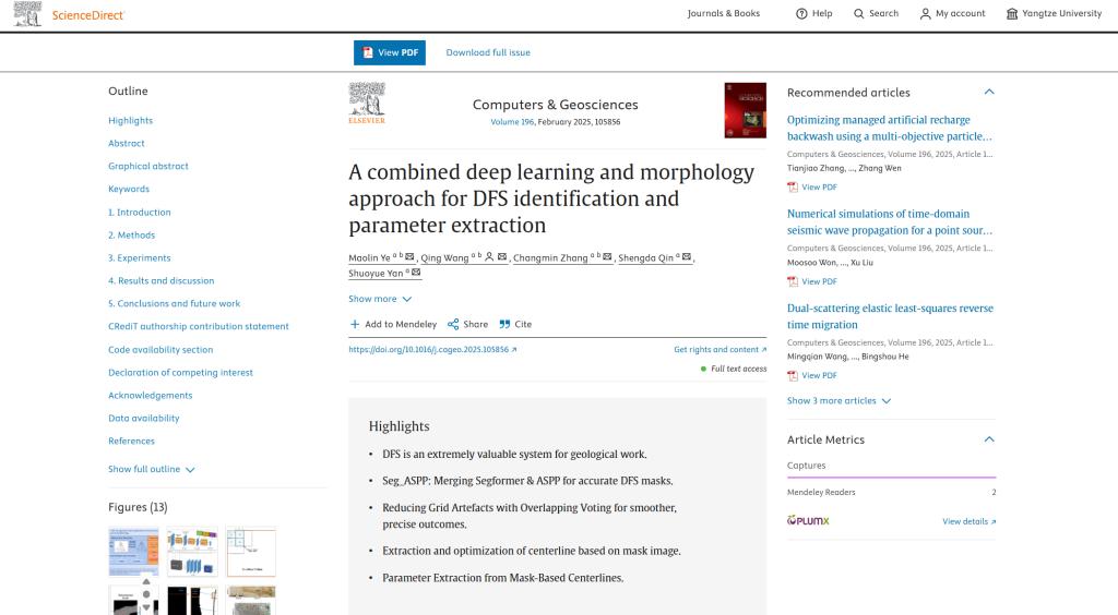 近日,地科学院硕士生叶茂林在导师王庆副教授的指导下,于SCI二区期刊《Computers & Geosciences》发表题为《A combined deep learning and morphology approach for DFS identification and parameter extraction》的研究论文,提出一种融合深度学习与河流形态学的分布式河流系统(DFS)参数自动化提取方法,为沉积盆地分析与资源勘探提供了智能化解决方案。