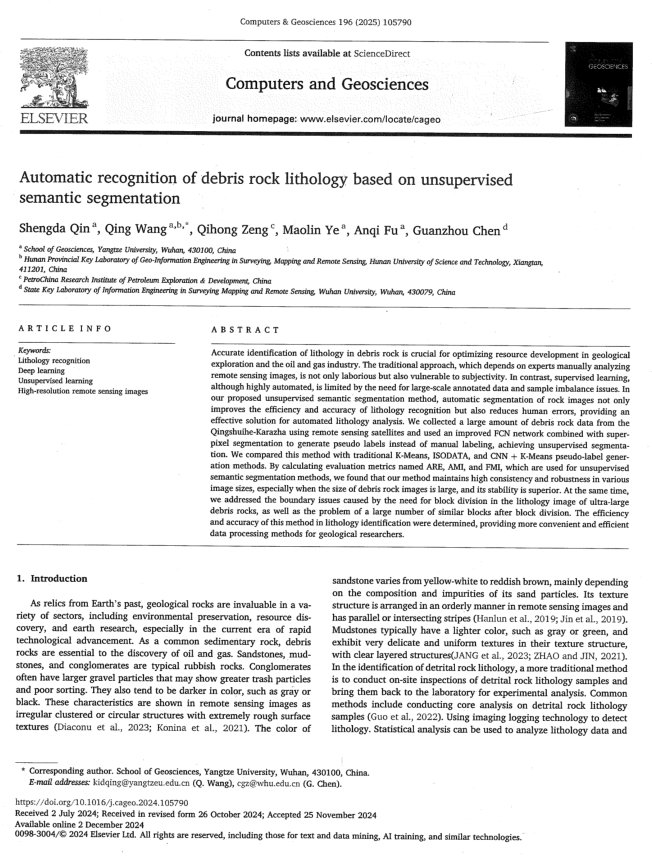 近日,伟德国际1949官网测绘工程专业2025级硕士生秦声炟在SCI-2区期刊《Computers & Geosciences》发表题为“Automatic recognition of debris rock lithology based on unsupervised semantic segmentation”的研究论文。伟德国际1949官网为论文第一署名单位,硕士生秦声炟为论文第一作者,其导师王庆副教授为通讯作者。