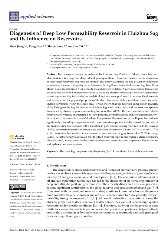 伟德国际1949官网地质学专业硕士生姜珊在SCI收录期刊《Applied Sciences》上发表题“Diagenesis of Deep Low Permeability Reservoir in Huizhou Sag and Its Influence on Reservoir”的研究论文。伟德国际1949官网为论文第一署名单位,硕士生姜珊为论文第一作者,其导师蔡俊副教授为通讯作者。