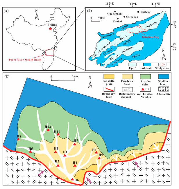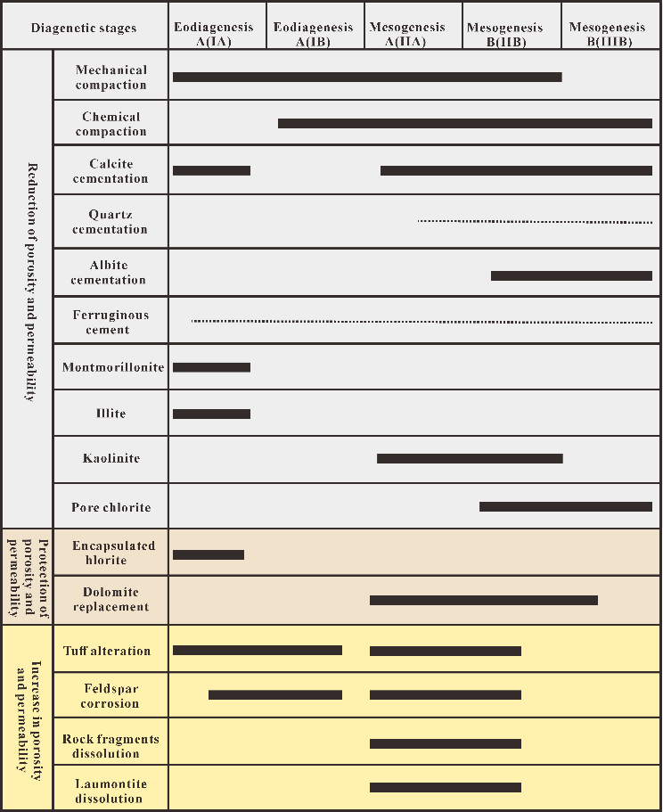 现阶段恩平组深层和超深层低渗致密砂岩油气是整个珠江口盆地惠州凹陷油气勘探开发的主要对象,储层总体表现出“低孔-低渗-强非均质性”的特点。本文基于岩心资料,对研究区恩平组深层低渗砂岩储层的成岩作用及其对储层物性的影响进行了综合分析。研究结果表明:阳江古近系恩平组储层成分成熟度较高,储集空间以溶蚀孔隙为主,占比超过50%,储层总体为低孔低渗的孔隙型储层。恩平组整体处于中成岩阶段(IIA-IIB),其成岩序列为:早成岩A期(IA)—绿泥石包壳/机械压实→早成岩B期(IB)—机械压实/凝灰质蚀变/长石溶蚀→中成岩A期(IIA)—机械压实/方解石胶结/长石溶蚀/岩屑溶蚀/高岭石胶结→中成岩B期(IIB)—化学压实/白云石胶结/孔隙绿泥石/石英加大。恩平组深层低渗储集层储集空间受成岩作用影响明显,其中压实作用显著地改变了恩平组储集层的孔隙度,减孔量为11.8%~26.3%(av.19.5%);胶结作用减孔量2.3%~30.1%(av.12.3%);溶蚀作用增孔量1.3%~24.8%(av.9.4%)。综合分析油气充注和储层孔隙演化匹配关系可知,该区深层储层类型属于“先致密后成藏”。