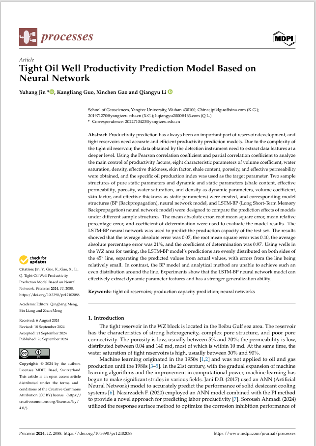近日,伟德国际1949官网地质学专业2022级研究生金宇航在SCI三区期刊《Processes》(IF=2.8)发表题为"Tight Oil Well Productivity Prediction Model Based on Neural Network"的研究论文。伟德国际1949官网为论文第一署名单位,研究生金宇航为论文第一作者,其导师郭康良教授为通讯作者。