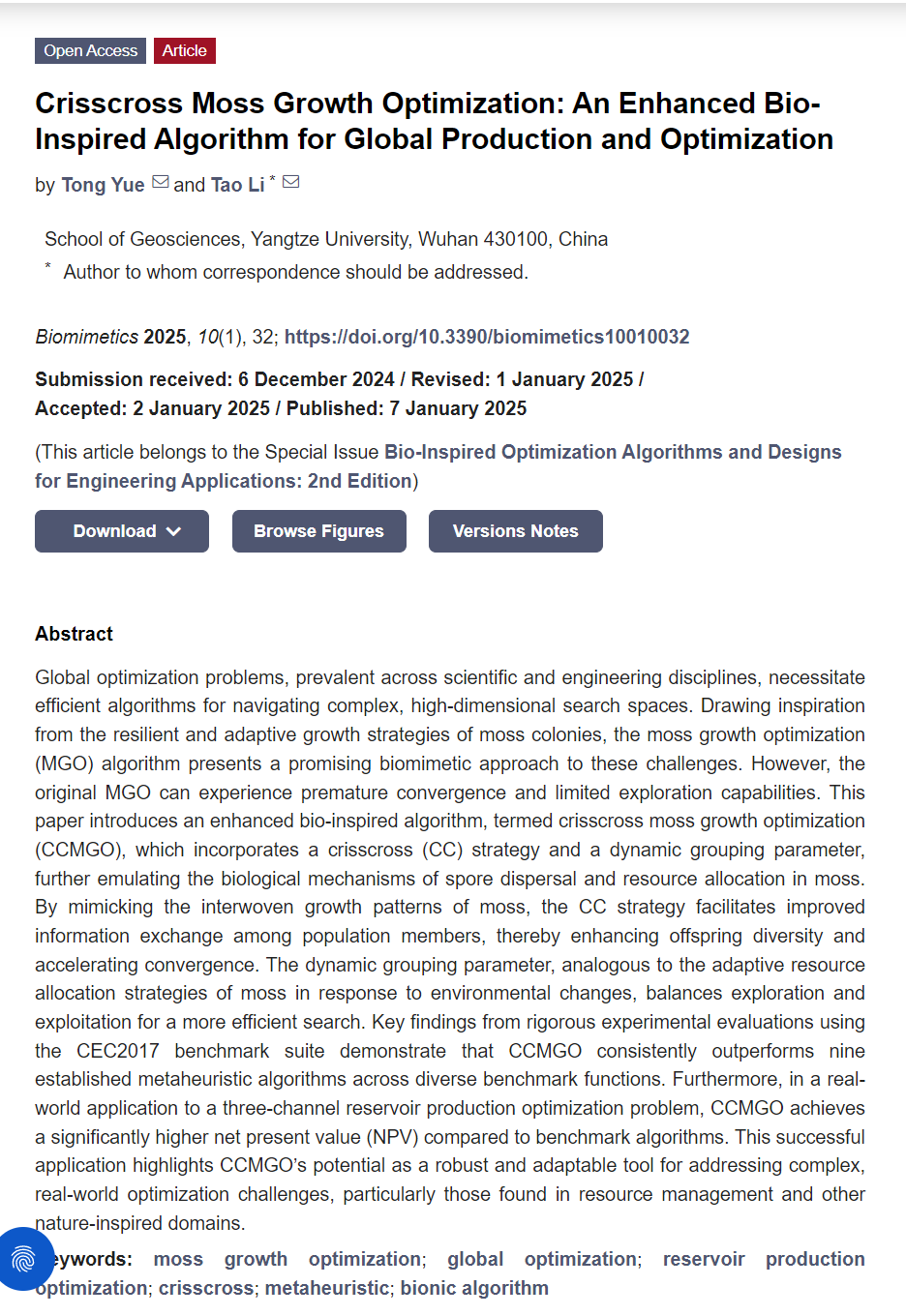 伟德国际1949官网硕士研究生岳彤在期刊《Biomimetics》上发表题为“Crisscross Moss Growth Optimization: An Enhanced Bio-Inspired Algorithm for Global Production and Optimization”的研究论文。伟德国际1949官网为论文第一署名单位,岳彤为论文第一作者。