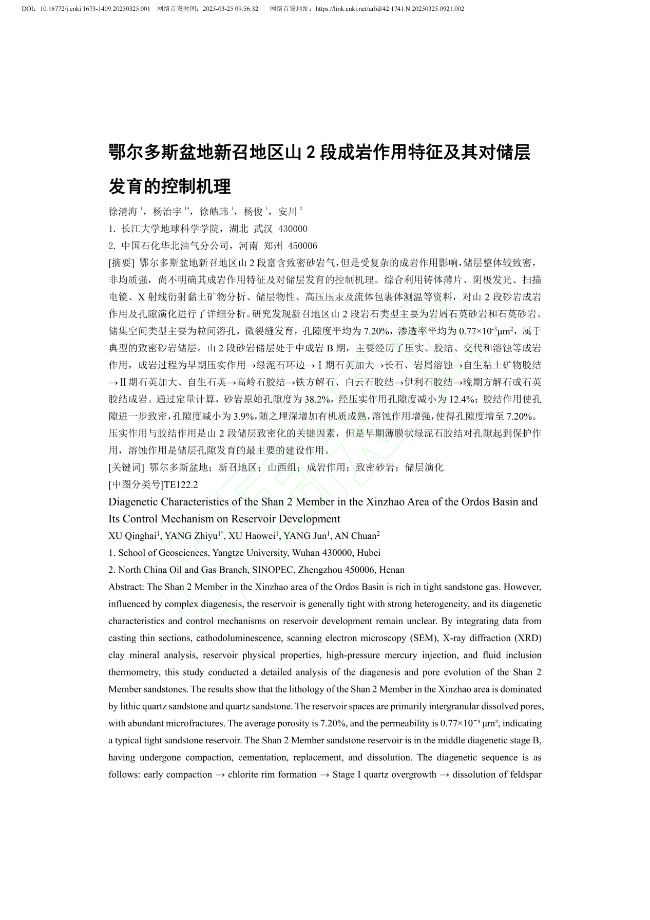 伟德国际1949官网硕士生杨治宇在《伟德国际1949官网学报》上发表题为“鄂尔多斯盆地新召地区山2段成岩作用特征及其对储层发育的控制机理”的研究论文,伟德国际1949官网为论文第一署名单位,徐清海副教授与杨治宇为共同第一作者。