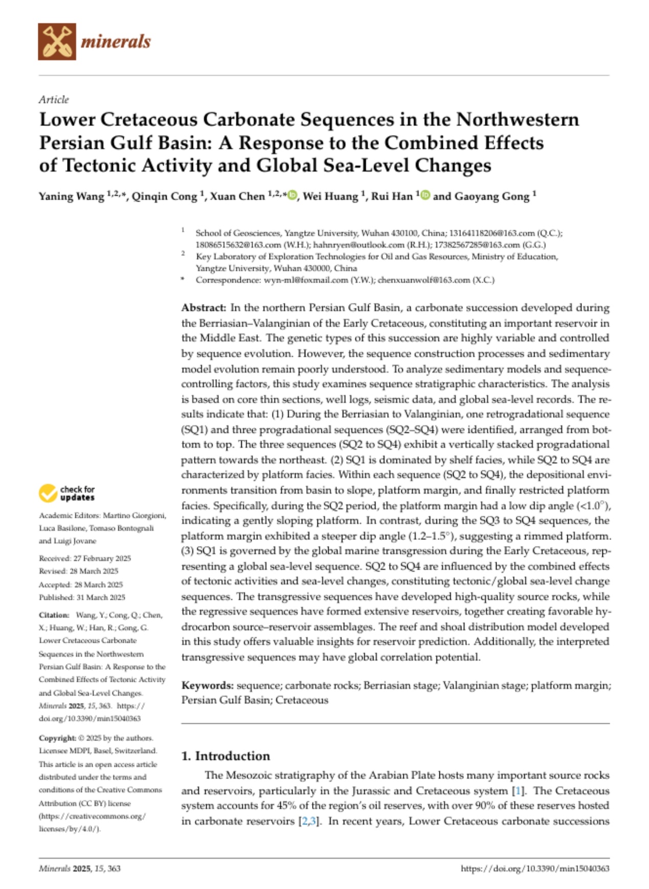 地科学院王雅宁副教授在《Minerals》上发表题为“Lower Cretaceous Carbonate Sequences in the Northwestern Persian Gulf Basin: A Response to the Combined Effects of Tectonic Activity and Global Sea-Level Changes”的研究论文。伟德国际1949官网为论文第一署名单位,王雅宁副教授为第一作者,研究生从琴琴为第二作者。