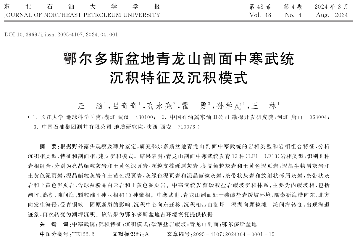 2024年8月15日,伟德国际1949官网22级硕士研究生汪涵在《东北石油大学学报》上发表题为“鄂尔多斯盆地青龙山剖面中寒武统沉积特征及沉积模式”的研究论文,伟德国际1949官网为论文第一署名单位,硕士研究生汪涵为论文第一作者,其导师吕奇奇副教授为该文通讯作者。