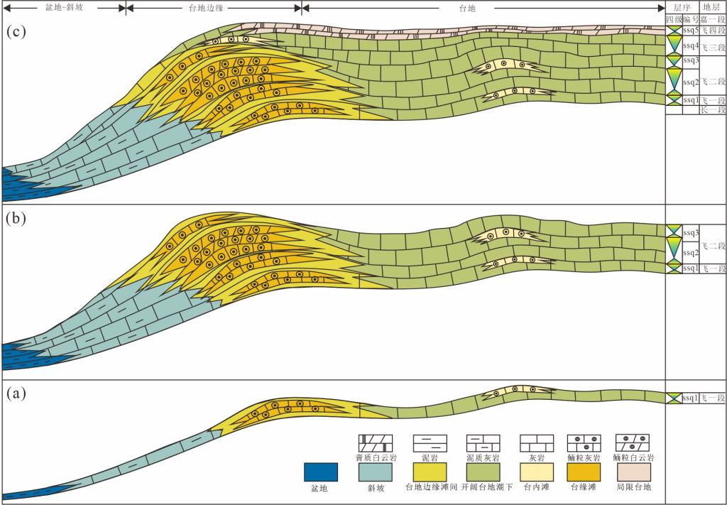 该研究对基于四川盆地东部铁山坡、七里北地区下三叠统飞仙关组岩心、岩石薄片、测井和地震资料综合分析,对其沉积相类型、演化规律及有利储集区带展开研究。研究区飞仙关组发育镶边型台地沉积模式,可细分为局限台地、开阔台地、台地边缘、斜坡及盆地五种沉积相,台地边缘为鲕滩发育有利相带;区内鲕滩发育具有明显加积—进积特征,纵向上多为2~3期叠置而成,在ssq2-ssq4时期均有分布,以ssq2时期规模最大(图1)。横向上滩体发育不稳定,具有向盆内迁移的趋势;储集岩类型主要为(残余)鲕粒灰岩、(残余)鲕粒白云岩及粉—细晶白云岩。台缘鲕滩是飞仙关组储层发育的有利微相,孔—渗条件良好;铁山坡地区坡5井—坡西1井—坡2井—坡1井一带为有利储层发育区带,七里北地区七里北1井—七北102井一带为潜在的有利储层发育区带。四级层序格架内不同地区滩体的时空分布及迁移规律,有利储集区带预测成果等可为深化该区鲕滩储层勘探开发提供依据。
