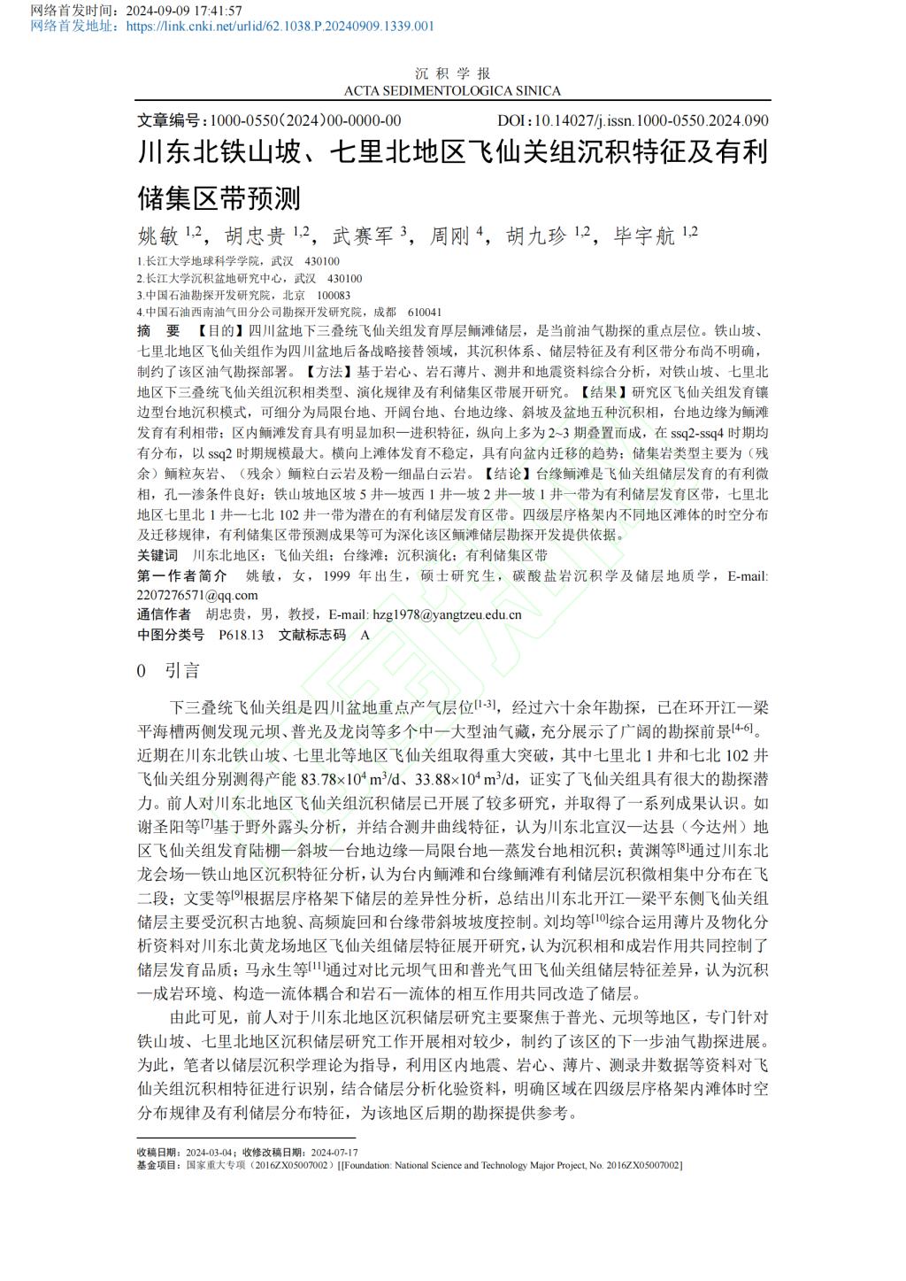 伟德国际1949官网22级硕士研究生姚敏在期刊《沉积学报》上发表题为“川东北铁山坡、七里北地区飞仙关组沉积特征及有利储集区带预测”的研究论文。伟德国际1949官网为论文第一署名单位,硕士研究生姚敏为论文第一作者,其导师胡忠贵教授为该文通讯作者。