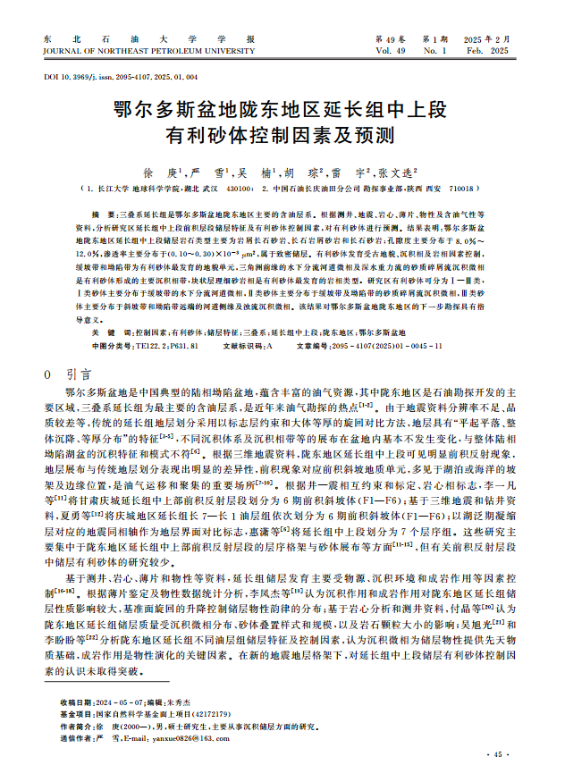地科学院硕士生徐庚在《东北石油大学学报》上发表题为“鄂尔多斯盆地陇东地区延长组中上段有利砂体控制因素及预测”的研究论文。伟德国际1949官网为论文第一署名单位,硕士生徐庚为论文第一作者,教师严雪为通讯作者。