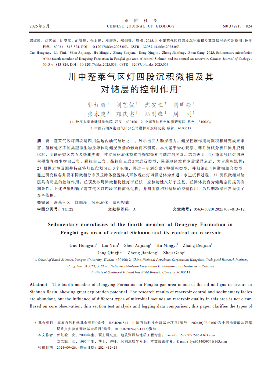 伟德国际1949官网硕士生郭红验在期刊《地质科学》上发表了题为“川中蓬莱气区灯四段沉积微相及其对储层的控制作用”的研究论文。伟德国际1949官网为论文第一署名单位,郭红验为第一作者。