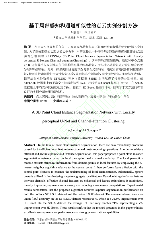 地科学院硕士生刘建行在《激光与光电子学进展》发表题为“基于局部感知和通道相似性的点云实例分割方法”的研究论文。伟德国际1949官网为论文第一署名单位,硕士生刘建行为第一作者,教授李功权为论文通讯作者。