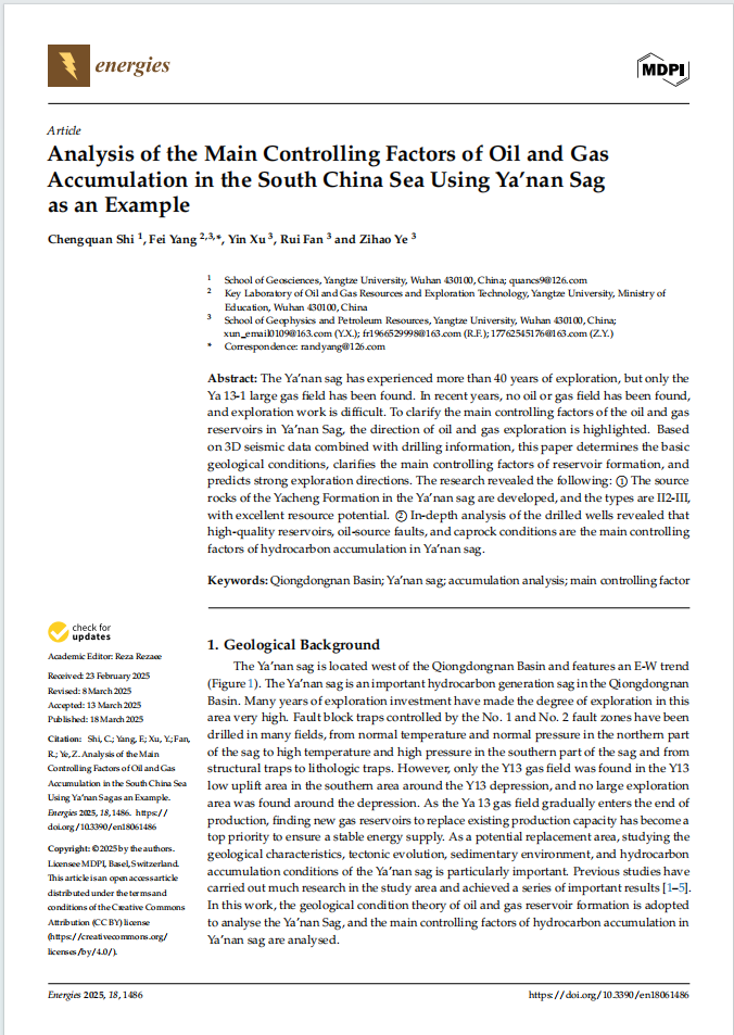 伟德国际1949官网地质资源与地质工程专业2022级研究生史成全在中科院四区期刊《Energies》(IF3.0)发表题为“Analysis of the Main Controlling Factors of Oil and Gas Accumulation in the South China Sea Using Ya’nan Sag as an Example”的研究论文。伟德国际1949官网为论文第一署名单位,研究生史成全为论文第一作者,其导师杨飞副教授为通讯作者。