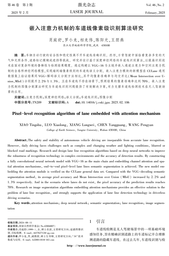 地科学院罗小龙副教授团队成员肖庭舒在期刊《激光杂志》上发表题为“嵌入注意力机制的车道线像素级识别算法研究”的研究论文。伟德国际1949官网为论文第一署名单位,硕士研究生肖庭舒为论文第一作者,其导师罗小龙副教授为该文通讯作者。