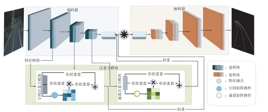 论文构建以VGG-16为主链并嵌入通道注意力和空间注意力机制的全卷积神经网络模型,实现端到端像素级别的车道线语义分割。嵌入注意力模块的新模型在CULane通用数据集上验证结果同VGG-解码语义分割方法相比,其平均像素准确率与均交并比(Mean Intersection over Union, MIoU)分别提升2.2%与1.3%。且在车道线不存在场景下,预测结果的像素准确率达到70%。嵌入注意力机制的图像分割算法研究为车道线识别问题提供了有效解决方案,有力支撑车道线检测技术在无人驾驶场景的应用。