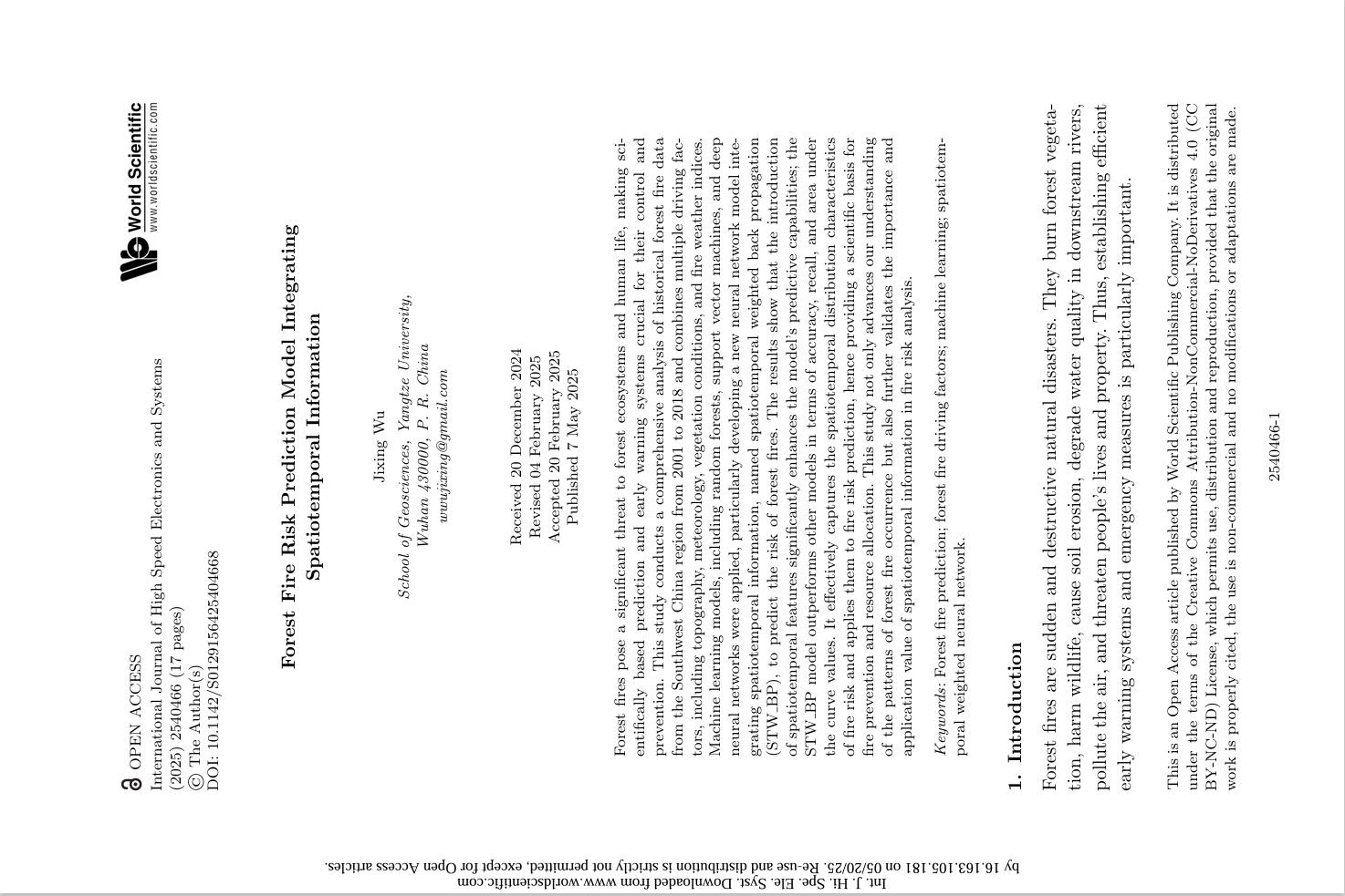 伟德国际1949官网硕士生吴集星在EI收录期刊《International Journal of High Speed Electronics and Systems》上发表题为“Forest Fire Risk Prediction Model Integrating Spatiotemporal Information”的研究论文。伟德国际1949官网为论文第一署名单位,吴集星为论文第一作者。