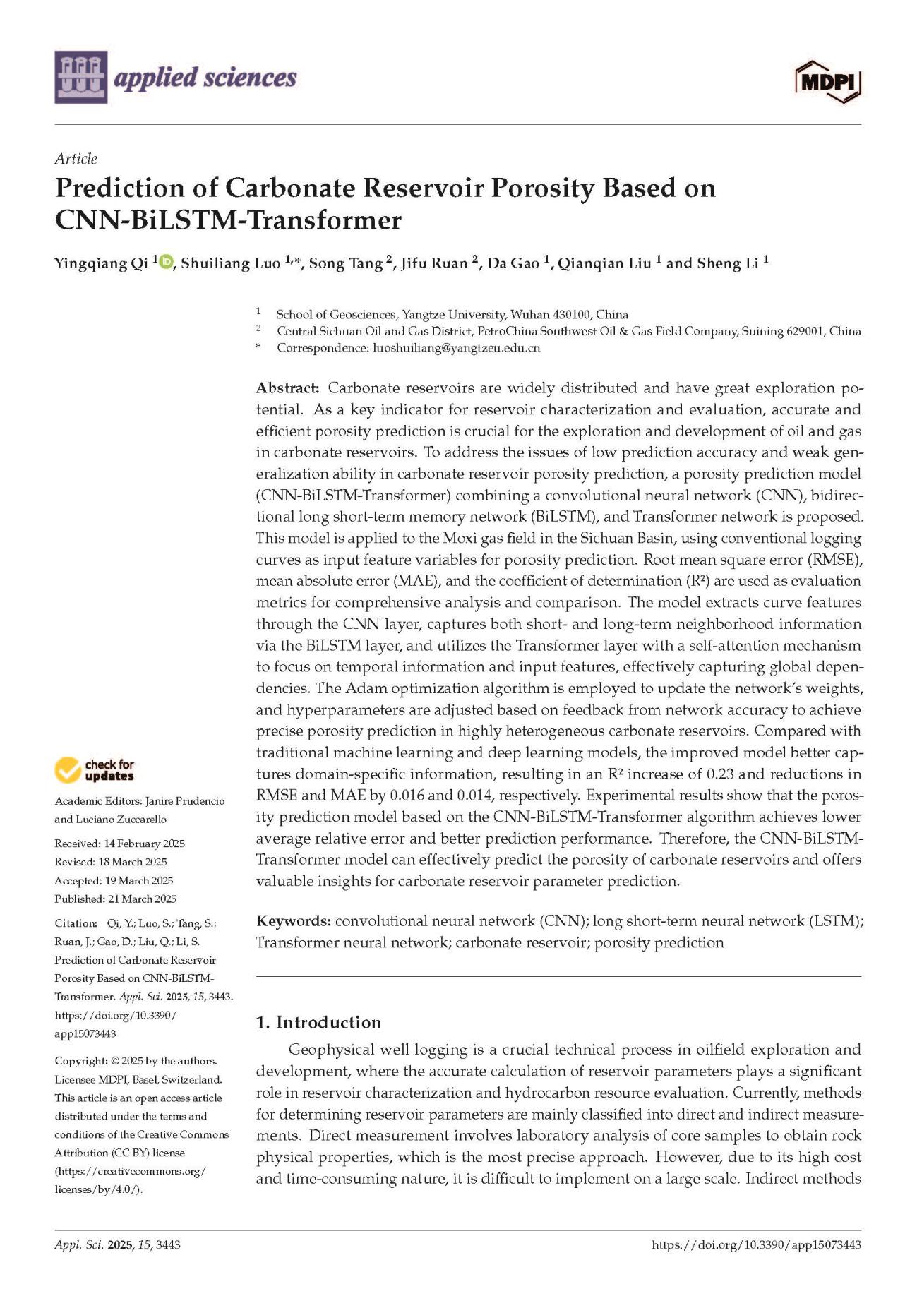 伟德国际1949官网硕士生漆影强在SCI收录期刊《Applied Sciences》上发表题为“Prediction of Carbonate Reservoir Porosity Based on CNN-BiLSTM-Transformer”的研究论文。伟德国际1949官网为论文第一署名单位,罗水亮副教授为第一通讯作者,论文由中国青年基金国家自然科学基金项目资助。