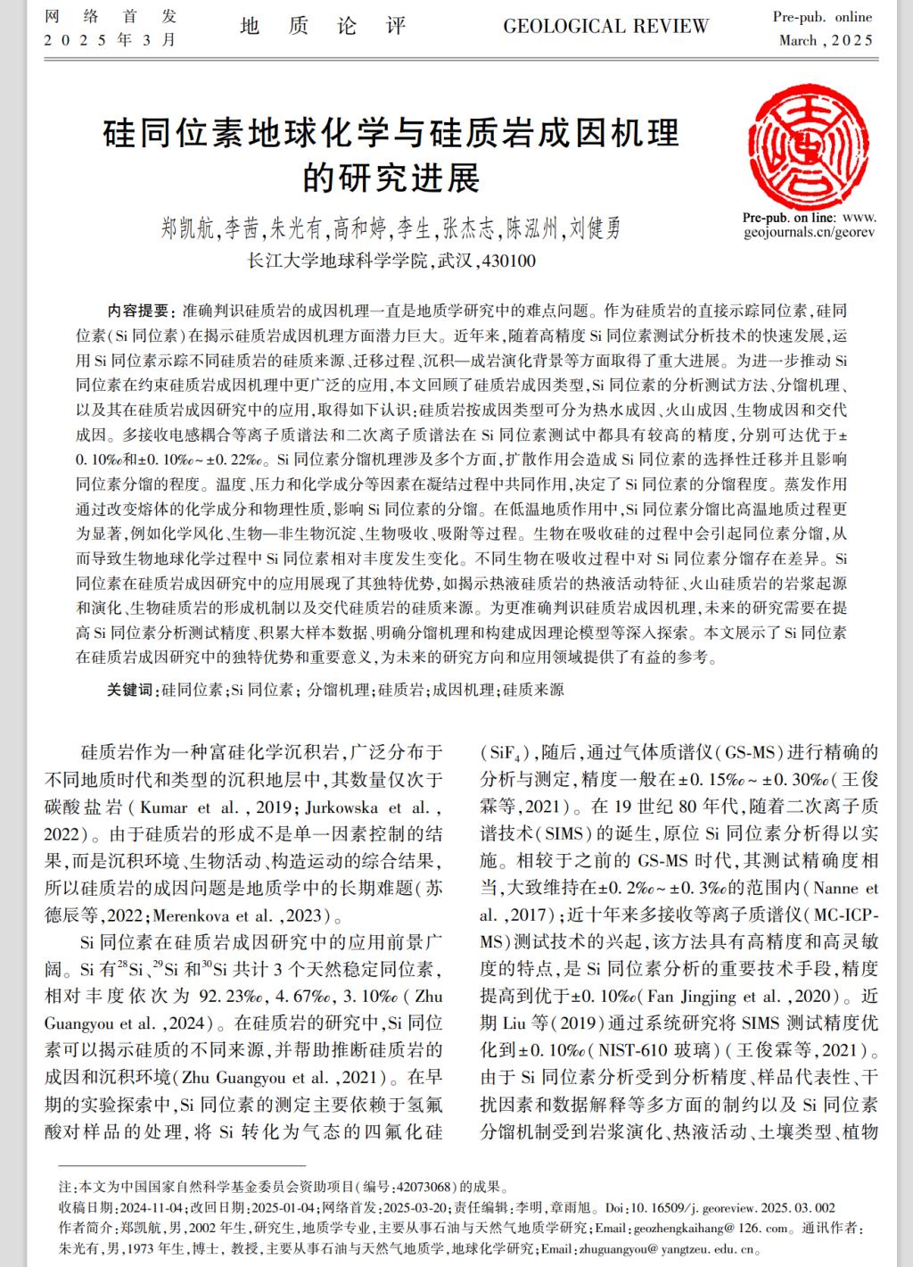 近日,伟德国际1949官网地质学专业2024级硕士生郑凯航在中文核心期刊《地质论评》发表题为“硅同位素地球化学与硅质岩成因机理的研究进展”的研究论文。伟德国际1949官网为论文第一署名单位,硕士生郑凯航为论文第一作者,其导师朱光有教授为通讯作者。
