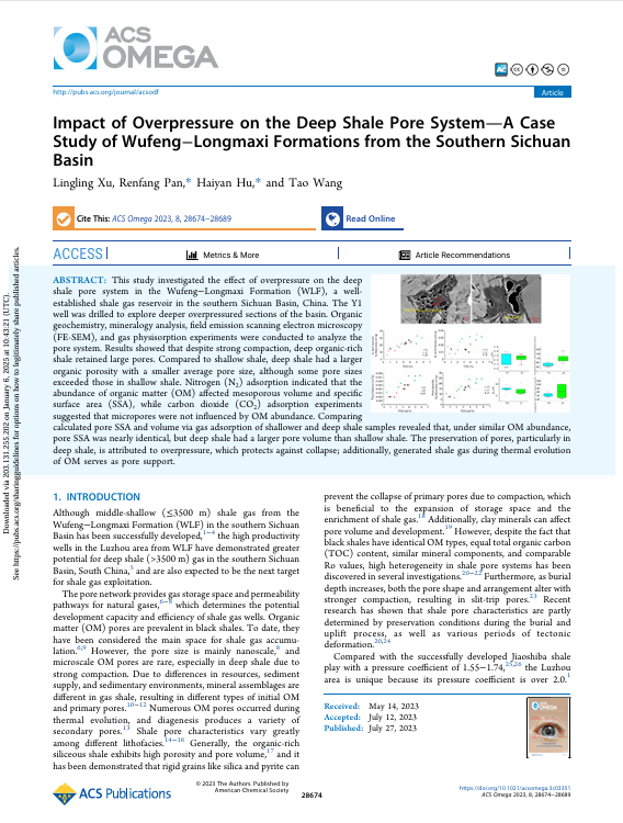 伟德国际1949官网石油系潘仁芳教授在地球化学领域主流期刊《ACS OMEGA》上发表题为“Impact of Over pressure on the Deep Shale Pore System—A Case Study of Wufeng−Longmaxi Formations from the Southern Sichuan Basin”的研究论文。