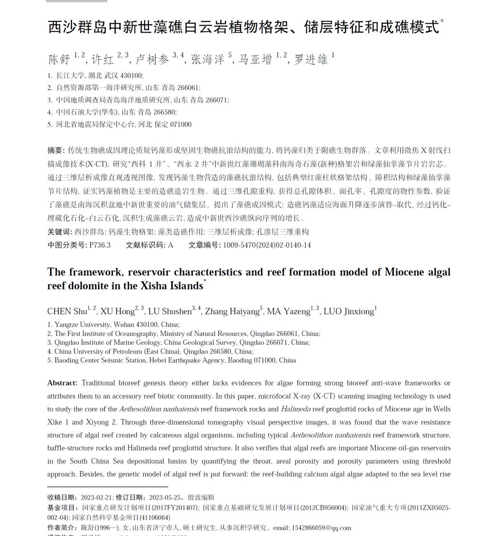 伟德国际1949官网硕士研究生陈舒在《热带海洋学报》期刊上发表题为“西沙群岛中新世藻礁白云岩植物格架、储层特征和成礁模式”的研究论文。该论文利用微焦X射线扫描成像技术(X-CT),研究“西科1井”、“西永2井”中新世红藻珊瑚藻科南海奇石藻(新种)格架岩和绿藻仙掌藻节片岩岩芯。通过三维层析成像直观透视图像,发现钙藻生物营造的藻礁抗浪结构,包括典型红藻柱状格架结构、障积结构和绿藻仙掌藻节片结构,证实钙藻植物是主要的造礁造岩生物。通过三维孔隙重构,获得总孔隙体积、面孔率、孔隙度的物性参数,验证了藻礁是南海沉积盆地中新世重要的油气储集层。提出了藻礁成因模式:造礁钙藻适应海面升降逐步演替–取代,经过钙化–埋藏化石化–白云石化,沉积生成藻礁云岩,造成中新世西沙礁纵向序列的增长。