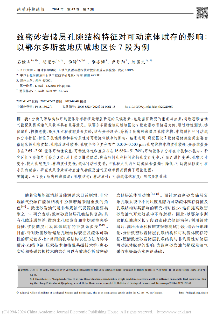 伟德国际1949官网博士生石桓山在期刊《地质科技通报》上发表题为“致密砂岩储层孔隙结构特征对可动流体赋存的影响:以鄂尔多斯盆地庆城地区长7段为例”的研究论文。伟德国际1949官网为论文第一署名单位,李涛教授为通讯作者。