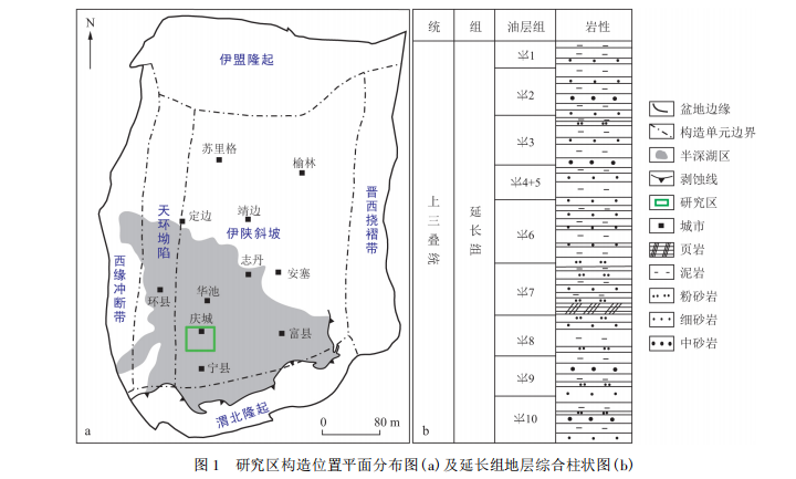 图1 研究区构造位置平面分布图及延长组地层综合柱状图